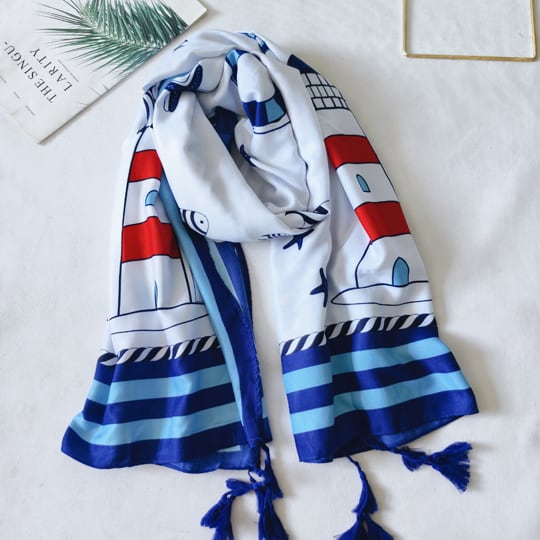 「エレガントな柄感と柔らかい素材が特徴のこのストールは、大人のコーディネートにぴったりのアイテムです☆ マリンモチーフのデザインは、ラダーや船のかじ、ヒトデを描いており、シンプルになりがちなコーディネートを優雅な雰囲気にアップデートしてくれます。季節感を感じながら、あなたのスタイルを華やかに演出してくれることでしょう。」