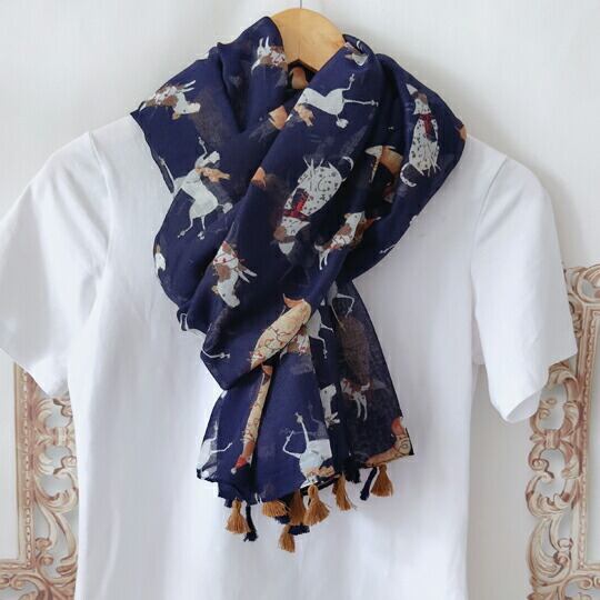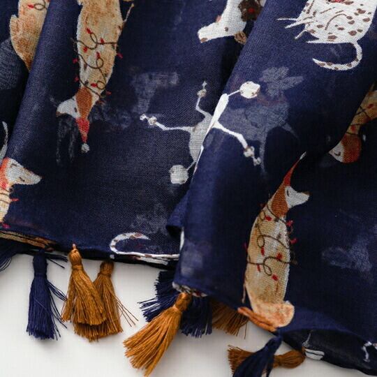 この「深みのあるネイビーの背景に様々なポーズを取る犬たちがデザインされた大判ストール」は、カジュアルな日常着からちょっとしたお出かけ着まで幅広いシーンで活躍します!ユニークな犬たちの姿が、ファッションに遊び心を加え、あなただけのスタイルを楽しむ手助けをしてくれることでしょう。