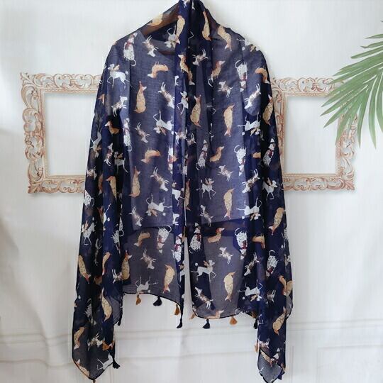 犬好きにはたまらない!深みのあるネイビー背景の犬たちデザイン大判ストール