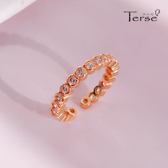 「TersCZダイヤが22粒並ぶ、シンプルだけども控えめな華やかさがあるデザインした指輪」は、洗練されたピンクゴールド色で仕上げられています。このリングは、キュービックジルコニアの輝きが際立ち、優雅な印象を与えます。単体での着用はもちろん、お持ちのリングとの重ね付けも楽しめるアイテムです☆