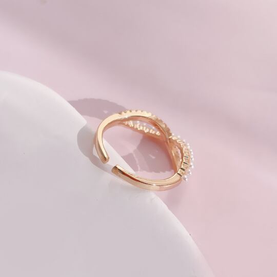 ■上品さを添える美しいデザイン!「Terse 小ぶりの真珠ラインとCZダイヤラインがクロスする大人女性のリング」は、エレガントな真珠と華やかなCZダイヤモンドが絶妙に組み合わさったフォークリングです。繊細なデザインが手元に上品さを引き立て、どんなシーンでも魅力を放ちます☆