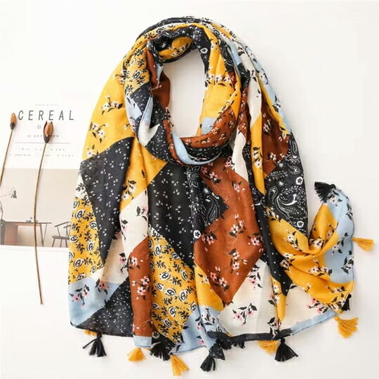 この「モダンで遊び心あるプリントが目を引くシルクスカーフ」は、シックなカラーが印象的な一枚です。パッチワークプリントが施されており、巻くだけでコーディネートに新たなアクセントを加えることができます。その柔らかなシルク素材は心地よく、贅沢なひとときを提供してくれます!