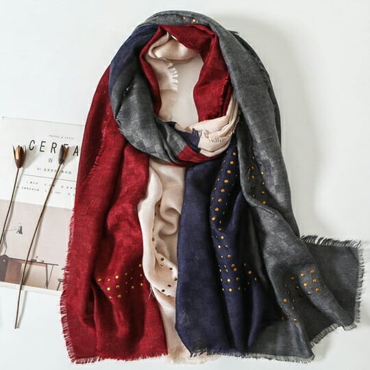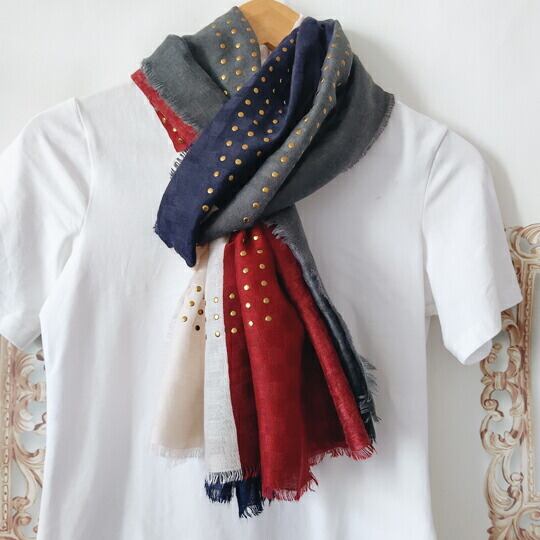 リベットが施されたレッド、グレー、ネイビー、ホワイトの色合いが特徴洗練されたデザインの大判ストールはっきりとした色使いとデザイン性を高めるアクセントが、どんな装いにも華やかさをプラス 柔らかな素材感が心地よく、季節を問わず活躍するアイテム ma0370a