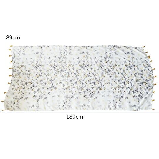 フェミニン蝶ちょストール 白地にプリントフリンジショール 首元にさらりと垂らしたり、ラフに巻いたりとアレンジしやすい長方形で、シンプルな装いもこれ一枚でぐんと洗練 柔らかい素材ではの上品な光沢とエレガントな柄が、お顔周りを明るく彩ります 春 ma0185a