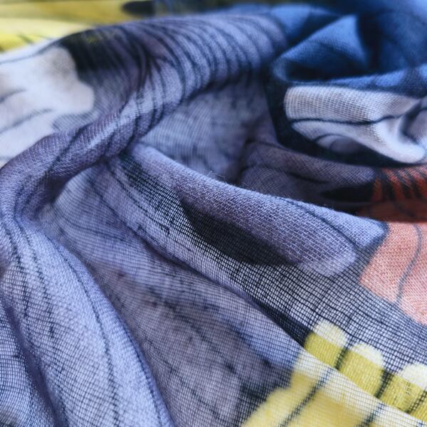 秋にぴったりのイチョウ葉テーマを基にしたデザインのスカーフ イエロー / ブラウン / ブルー / グレーの調和が鮮やかに描かれ、秋らしい豊かな雰囲気を演出 薄手のビスコース素材で肌触りが良く、シーンに応じて異なる表情を楽しめる ma0413aye