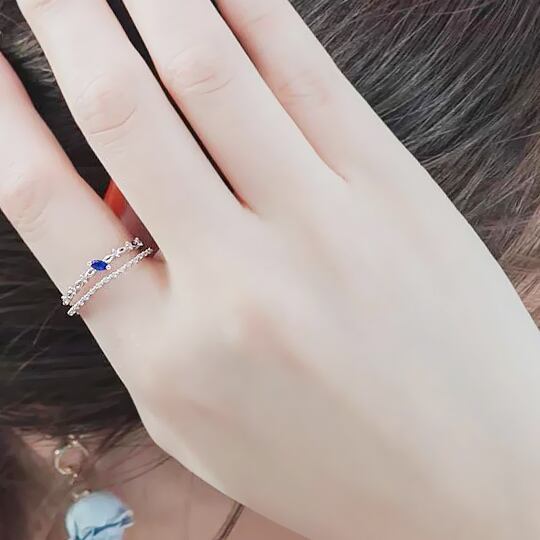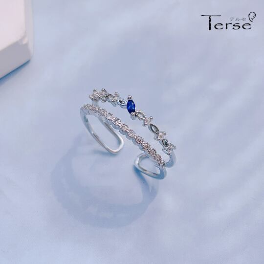 Terseクラシカルをテーマに、シンプルな中にさりげないデザインを施したCZダイヤ2連リング 夜空のような深いブルーのサファイア色キュービックジルコニアをあしらって ミル玉や刻みを施した透かし模様が、手元にレースのような繊細な陰影を描きますrs0237as3月誕生石