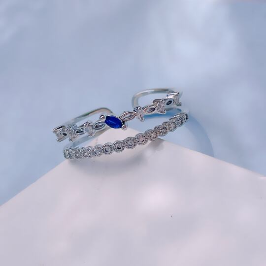 この「Terse クラシカルをテーマにしたCZダイヤ2連リング」は、さりげないデザインに深いブルーのサファイア色キュービックジルコニアが輝く逸品です!ミル玉や刻みを施した透かし模様が、手元にレースのような繊細な陰影を描き出し、特別なシーンや日常使いでも抜群の存在感を発揮します。