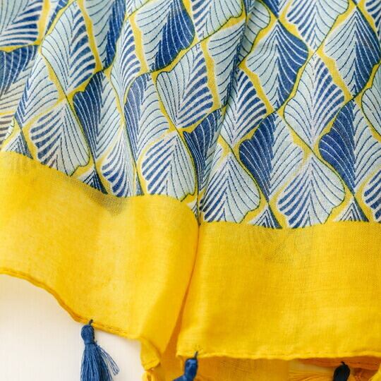 幾何学的な葉の抽象的なプリントストール ライトブルーに爽やかなイエローがポイントに シンプルながら上品で大人な印象 シワになりにくい素材なのでバッグの中に入れて持ち運ぶことも可能で、夏のエアコン対策としても使用でき ma0264a