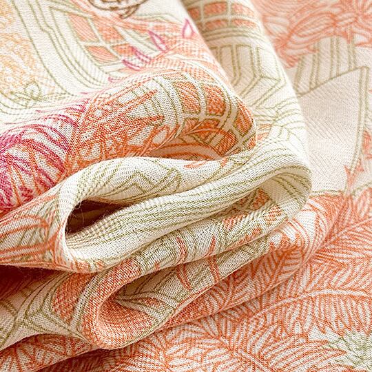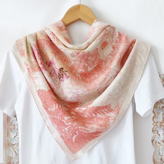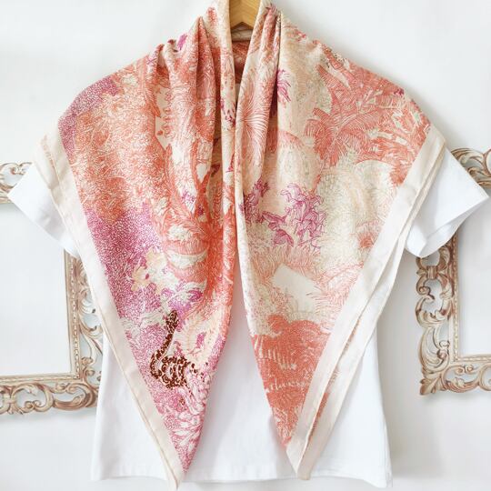 南国の別荘の庭園を思わせるデザインのスクエアスカーフ 熱帯植物をインスパイアしたプリントが施され、優しい雰囲気を醸し出し ピンク色を基調とした色合いが どんな装いにも華やかさをプラス 日常のコーディネートに取り入れることで、エレガントな印象を与え ma0408a