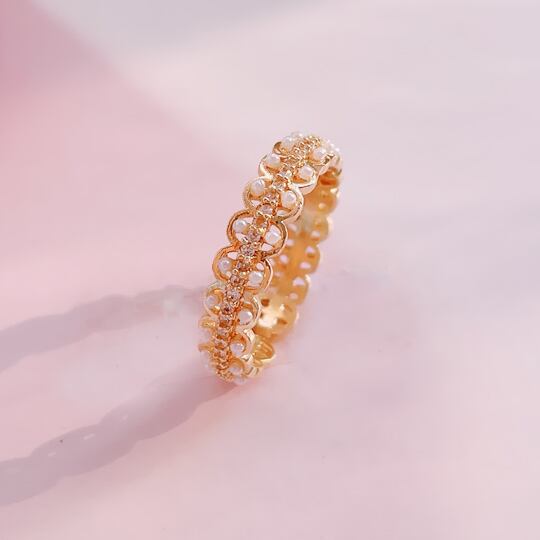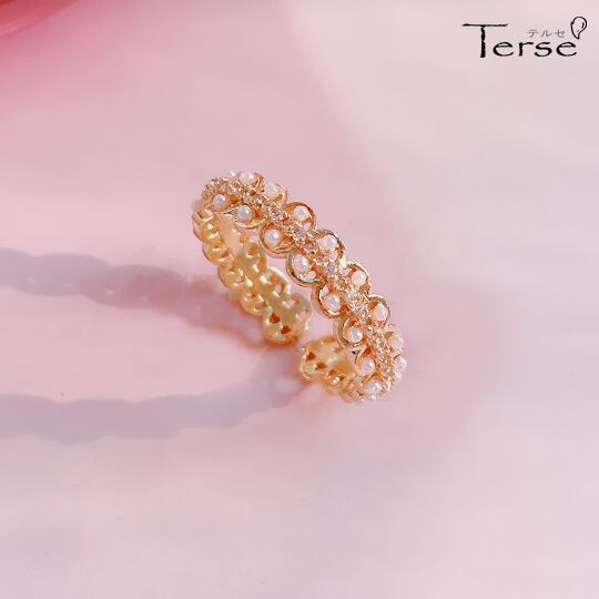 Terseゴールドの輝きでベビーパール編み込まれたレース模様がポイントフォークリング 肌なじみがいいので、手元をより大人な印象に シンプルだけど飽きがこないデザインなので長く愛用 シャツやブラウスなどのお仕事スタイルにもマッチしやすい rs0323ag