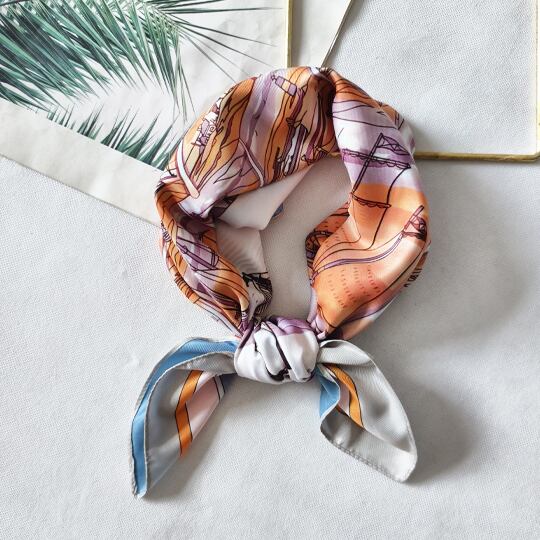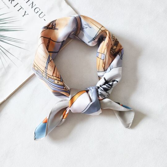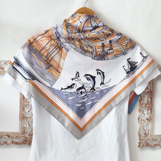 夏にぴったりの海洋テーマを基にしたデザインのリバーシブルスカーフ 繁栄や生命の象徴のアンモナイトが描かれ、ヨットやイルカが優雅に配置され シーサイドの雰囲気を演出 縁に施された線が全体を引き締め シーンに応じて異なる表情を楽しめる両面仕様 ma0406a
