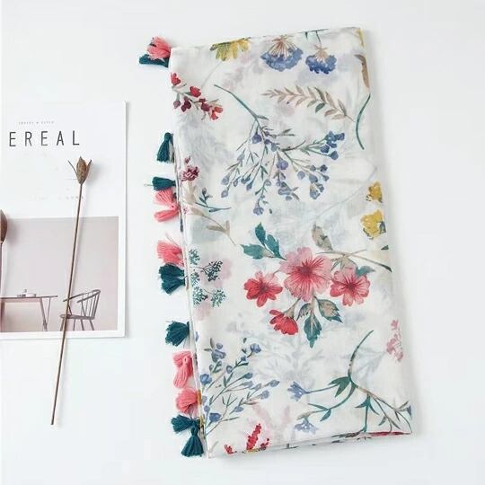 繊細な水彩画調のフラワーモチーフをプリントしたトロピカルな印象のストール。カジュアルスタイルに合わせやすいレトロな花柄 縁部分にふさふさなポンポンをあしらったプリーツデザイン 透け感のある上質で肌触りの良い生地を使用 ma0077a 8月誕生花