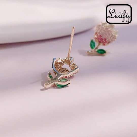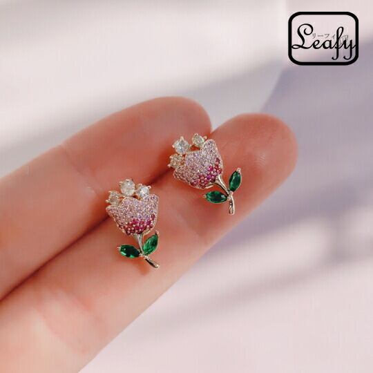 「Leafy☆この美しいチューリップモチーフのピアスは、圧倒的な存在感を放ち、日常使いはもちろん、特別なシーンでも華やかさを演出するアイテムです☆キュービックジルコニアをフラワーの形に敷き詰めたデザインが、見ているだけでも心が躍る豪華さを実現。女性らしいアクセントを添え、立体感に溢れたエレガントな印象を与えてくれる一品です!デートやお呼ばれ、誕生日プレゼントとしても最適なアイテムです。」