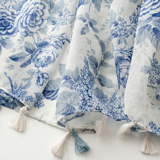 色鮮やかな清楚さを首元に!Terse 透け感のある白地に青色のブルーローズプリントストール