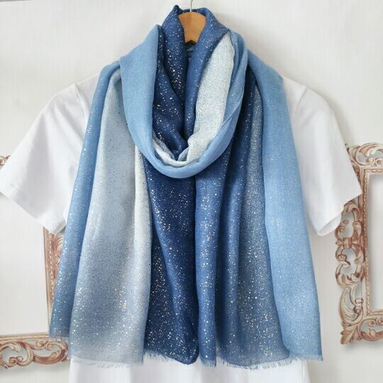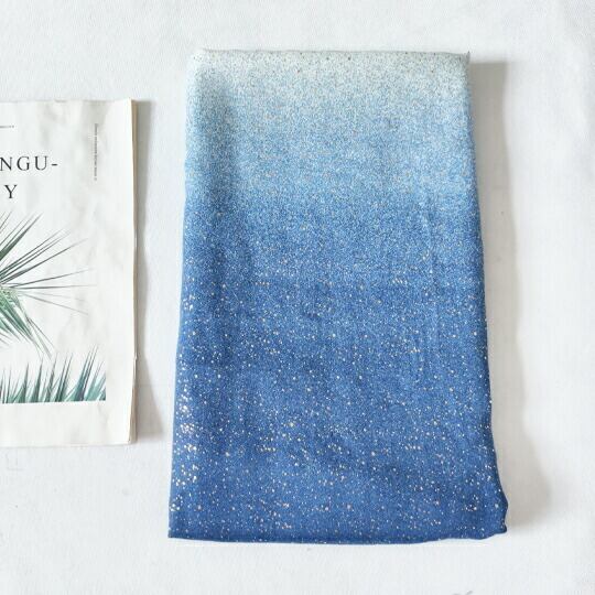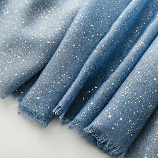 爽やかなブルーのグラデーションが美しい大判ストール 海をイメージしたデザイン 金箔のようなキラキラとした輝きが、光を受けるたびに優雅に煌めき、上品な印象を与え 日常の装いに華やかさを添えるだけでなく、特別なシーンでも活躍します シーサイド ma0403abl
