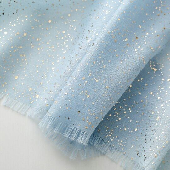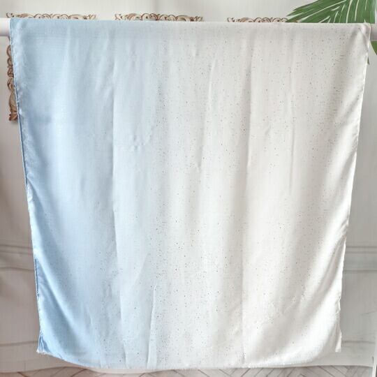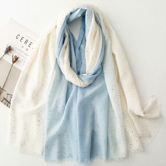 「どんな装いにも自然に溶け込む爽やかなブルーからホワイトへのグラデーションの大判ストール」は、特別な日にも日常のアクセントにもぴったりなアイテムです☆ 金散らしとラメが施されており、上品な輝きを放ちます。優しい配色は肌に馴染みやすく、季節を問わず活躍すること間違いなし! さっと肩に掛けたり、首に巻いたりと、多様なアレンジであなたのスタイルを引き立てます。