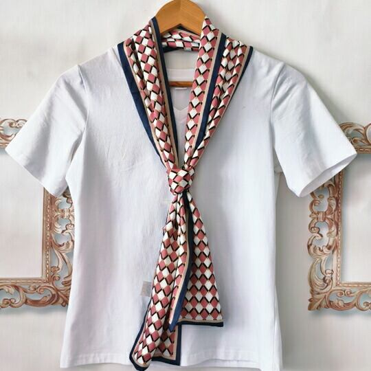 ブロックチェックの格子柄の細いスカーフ ピンクとホワイトの四角がチェス盤のように交互に配され、幾何学模様がレトロな雰囲気を醸し出し 飽きのこない魅力を持ち、さまざまなスタイルに合わせやすい 軽やかで上品な印象を与える 日常の装いにアクセントを ma0393a