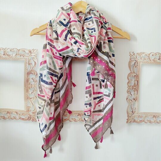 幾何柄 ピンク×グレー シック モダン 大判ストール 程よいボリューム感 ソフト 軽い 肌触り良好 タッセル付き ショールのように アレンジ自在 オールシーズン 2026トレンド 上品 大人可愛い おでかけ オフィス 通勤 ギフト プレゼント レディース ストール スカーフ ma0321a