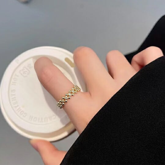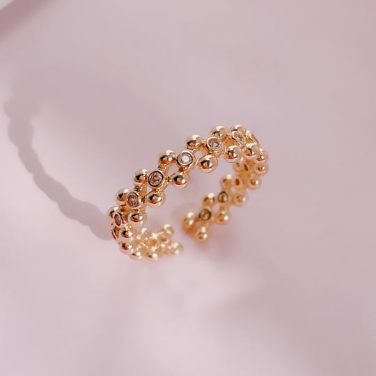 このリングは、ゴールド色の華やかな輝きが特徴で、重ね付けにも最適です。カジュアルなファッションからドレスアップまで、幅広いスタイルに応じてお楽しみいただけます。あなたの手元を美しく飾り、優雅な印象を与えるこのアイテムを身に着けて、日常の中にちょっとした贅沢を加えてみませんか?