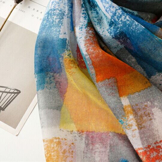 美しい色使いで油絵画風のぼかし幾何学柄を表現したプリントストール シックなコーディネイトに華やかさをプラス ストール初心者にも使いやすい幾何学模様 薄手の生地で大変やわらかく心地よい巻き心地を楽しめるアイテム UVカット 日焼け止 冷房対策 お出かけma0234a