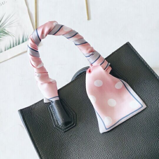 優しいピンク色にさくらを思わせる水玉模様が施された細いスカーフ バンドー・ツイリーとして、カジュアルな装いにぴったりのアイテム 柔らかい素材感が首元に優しくフィットし、日常のコーディネートに華やかさを添え シンプルながらも洗練されたデザインma0304apk