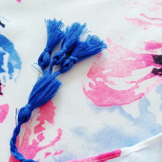 軽くてふわりと風になびくような風合いと優しい水彩タッチの花柄ストール くるりと巻けば顔周りも華やかに オフホワイトにタヒチピンク&ゼニスブルーふんわりした夏らしい色合いフラワー柄で幅広いコーディネートにマッチします 大判 薄手 タッセル付き ma0239a