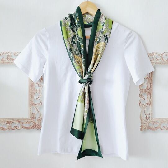 「オパールグリーンの背景とジャングルグリーンのボーダーに花の絵を描いたスカーフ」は、細いタイプのアイテムで、上品かつ遊び心溢れるデザインが魅力です。首やリストにポイントで使ったり、バッグにツィリーのように巻き付けたり、リボンとしてアレンジしたり、ヘアアクセとしてバンダナ風に使うこともできます。多彩な使い方が可能で、あなたのスタイルを一層引き立てます!