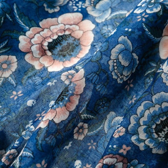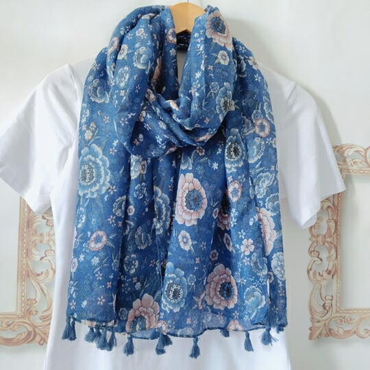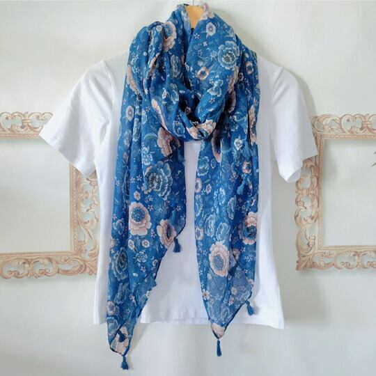 ブルー基調 ピンクの花アクセント 華やか色合い 大判ストール 優雅さプラス 軽やか 柔らかな素材感 肌触り抜群 シンプル装いにエレガント オールシーズン レディース おでかけ ギフト プレゼント ストール スカーフ ma0353a