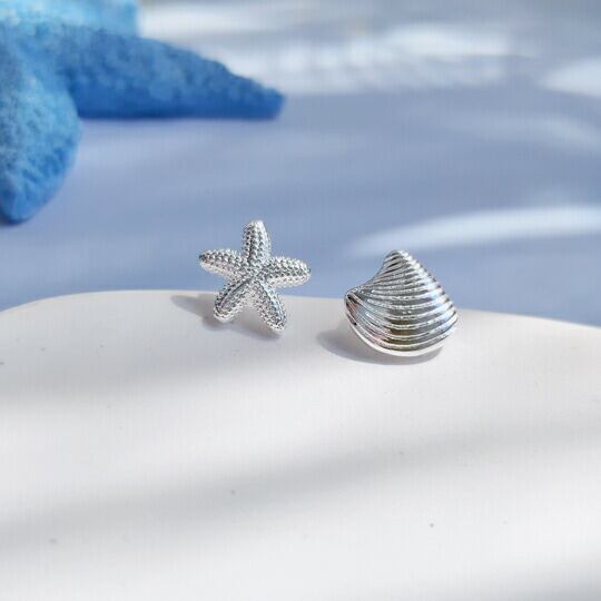 Terse 夏の海辺を思わせる貝殻とヒトデミニピアス この小さくて繊細なアクセサリーは、涼しげな印象を与え、どんな夏の装いにもぴったり マリンスタイルを象徴するヒトデとシェルの形は細部まで精巧に作られており、シルバーが日差しを受けて美しく輝き se0335a