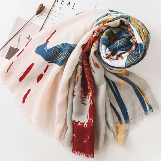 この大判ストールは、優しいベージュを基調に、南国の植物やフェザーを印象的にあしらったデザインが特徴です。自然の美しさを感じさせるアートな柄が、洗練された印象を与え、春の装いにぴったりのアイテムです。軽やかな素材感が、さわやかな風を感じさせることでしょう!