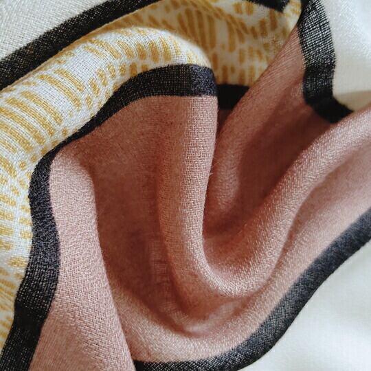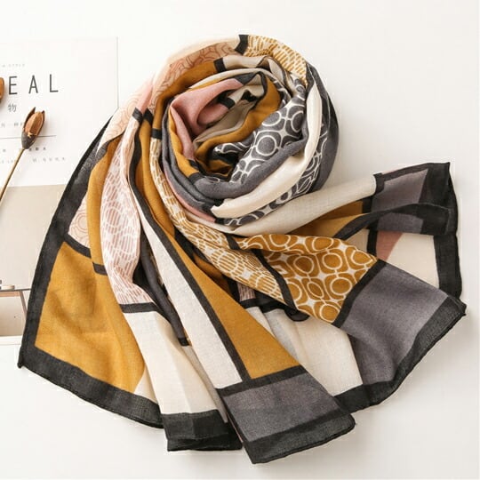 オランダの抽象画家ピエト モンドリアンの作品に着想を得てデザインされた大判プリントストール イエロー、グレーなどニュアンスカラー&幾何学模様が黒の水平線と垂直線で分割されモデンなデザイン 柔らかい生地感と配色のバランス良い オンオフ問わずma0280aye
