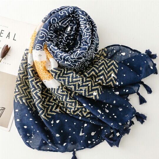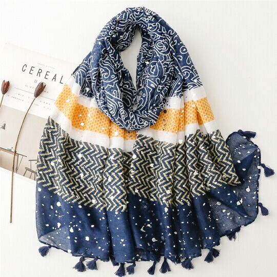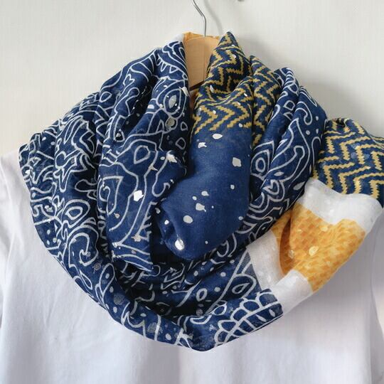 優雅で柔らかな曲線と草花をイメージしたペイズリー柄大判ストール 黄色の幾何学模様とにブルー色のペイズリー柄を合わせた、インパクトがあるのに個性的すぎずなデザイン 英国スコットランド西部にある町「ペイズリー」に発祥したヨーロッパ代表柄マフラー ma0314a
