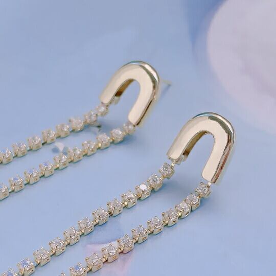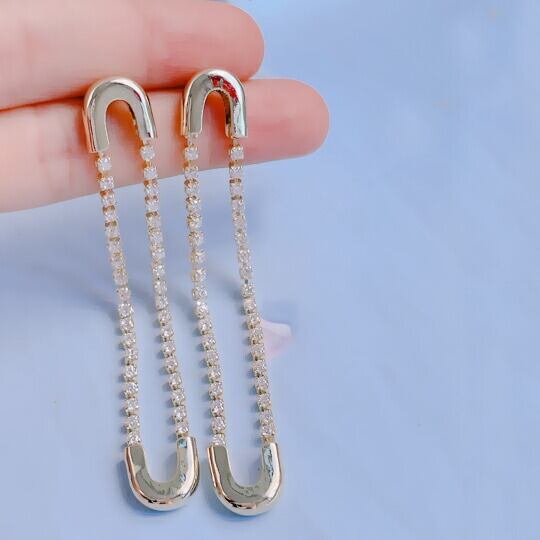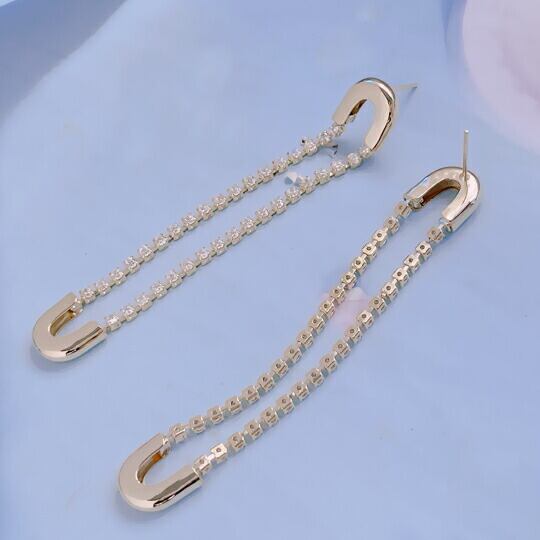 安全ピンモチーフ ビジューチェーン ロングピアス 大振り CZダイヤ 輝き 煌き 存在感 インパクト エレガント モダン ドレープデザイン シックな雰囲気 どの角度からも美しい 品良く フェースライン レディース お出かけ パーティー ギフト プレゼント sr00754yg