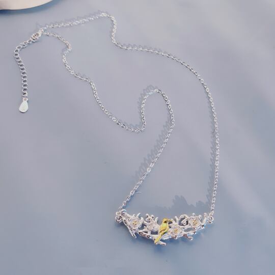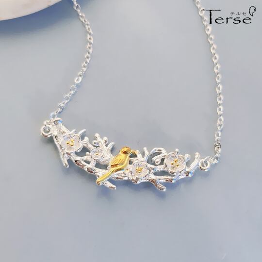 春を感じる上品なデザイン!「梅の花×鶯 銀の花の枝に金の小鳥 ペンダント」で、あなたのスタイルに華やぎをプラスしませんか?