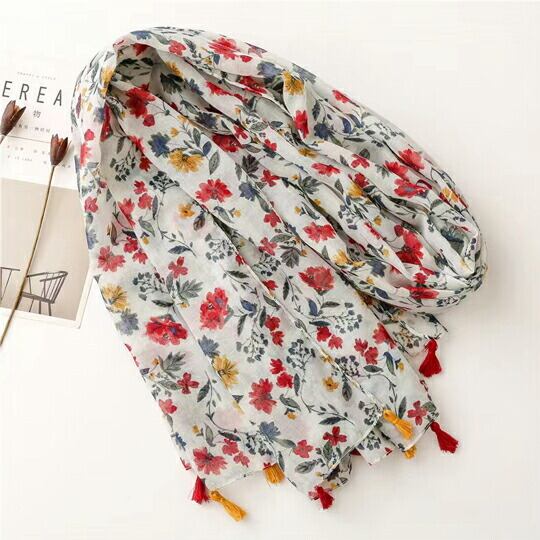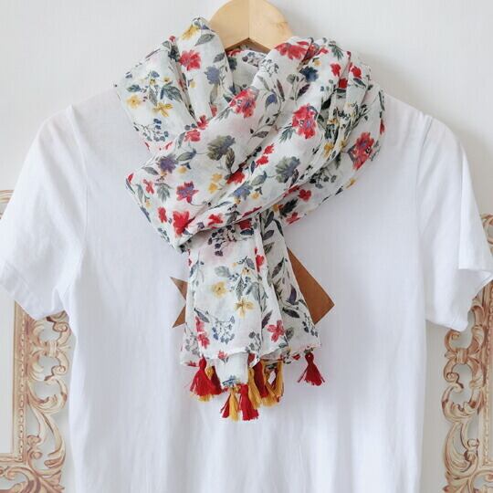 日々のコーディネートに華やかさをプラスするレトロなふわわ―ストール 透け感のあるふわりと軽い素材感 どこか素朴な温かみのある小花柄が上品です 大小様々な花がデザインされたエレガントな一品 スカーフ タッセル付き コスモス リゾート ma0246a