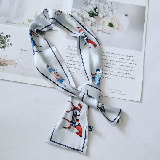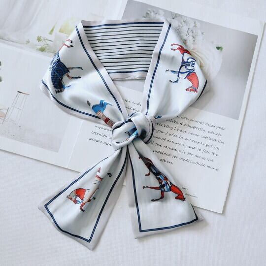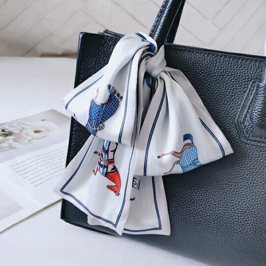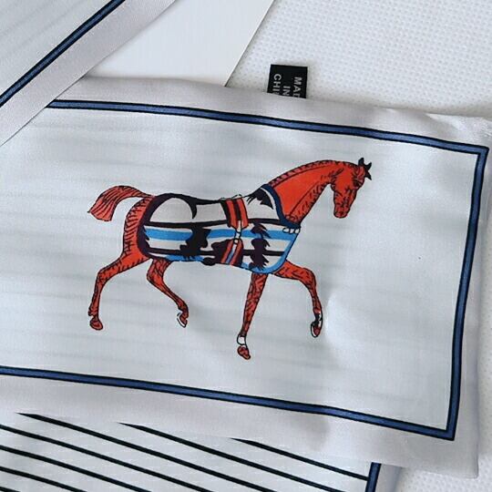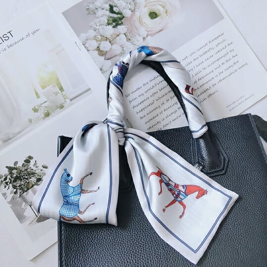 ホース柄大人可愛い細長いタイプのスカーフ 旬なクラシカルモチーフでコーデを盛り上げますリバーシブル柄なので、結んだりねじった時も柄の雰囲気を楽しめる ツイリー 軽い 柔らかい質感が魅力で、 光沢感 肌に寄り添うような滑らかな 肌触りをお楽しみ ma0310a