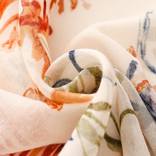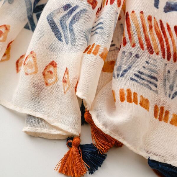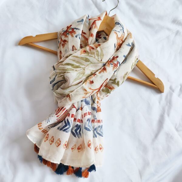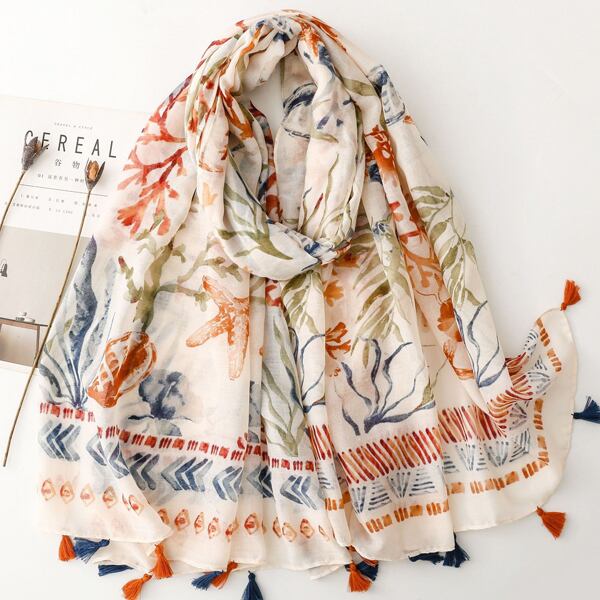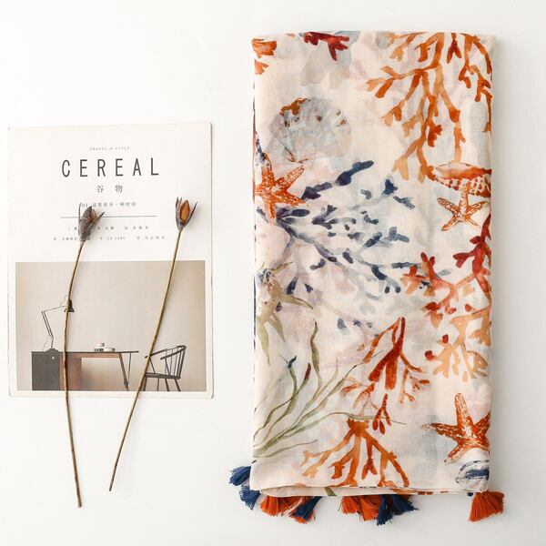 夏にぴったりのマリンテーマを基にしたデザインのスカーフ 水彩風のサンゴやヒトデ、貝殻のモチーフが描かれ、オレンジとブルーの調和が優雅に配置され トロピカルなビーチの雰囲気を演出 裾に施されたオレンジとブルーのタッセルが全体を引き締め シーンに応じて異なる表情を楽しめる薄手仕様 ma0415a