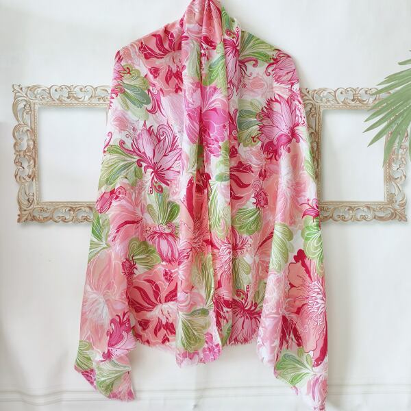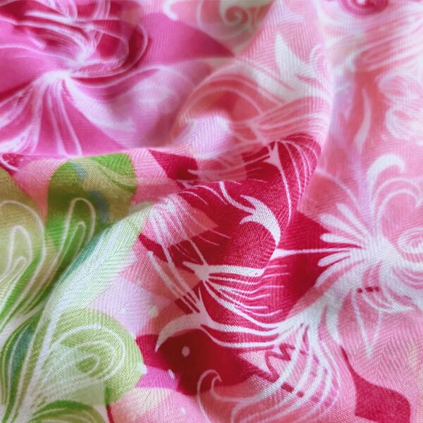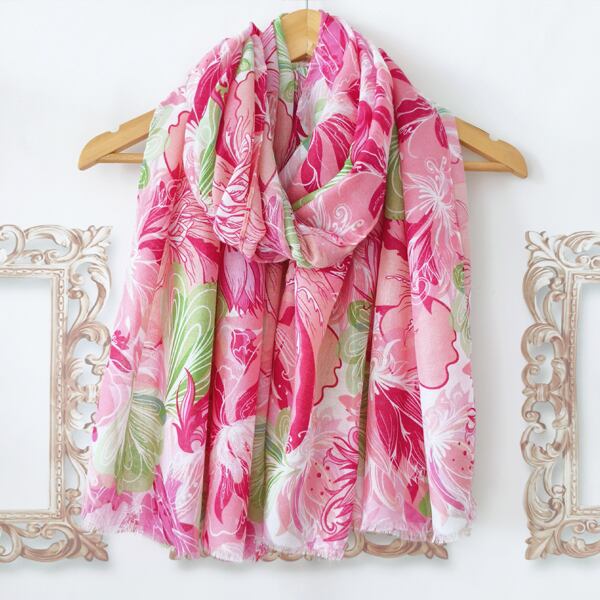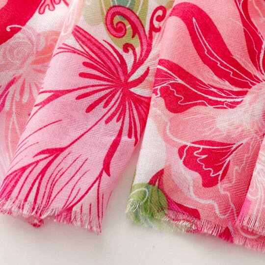 春にぴったりのフラワーテーマを基にしたデザインのスカーフ 豊かな生命力や華やかさを象徴する大輪の花柄が描かれ、ピンクとグリーンの調和が優雅に配置され 春の花園のような雰囲気を演出 裾に施されたフリンジが全体を柔らかく引き締め シーンに応じて異なる表情を楽しめる薄手仕様 ma0411a