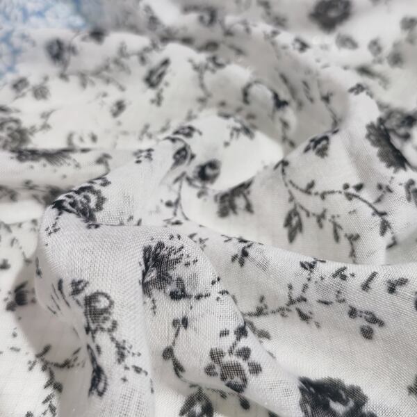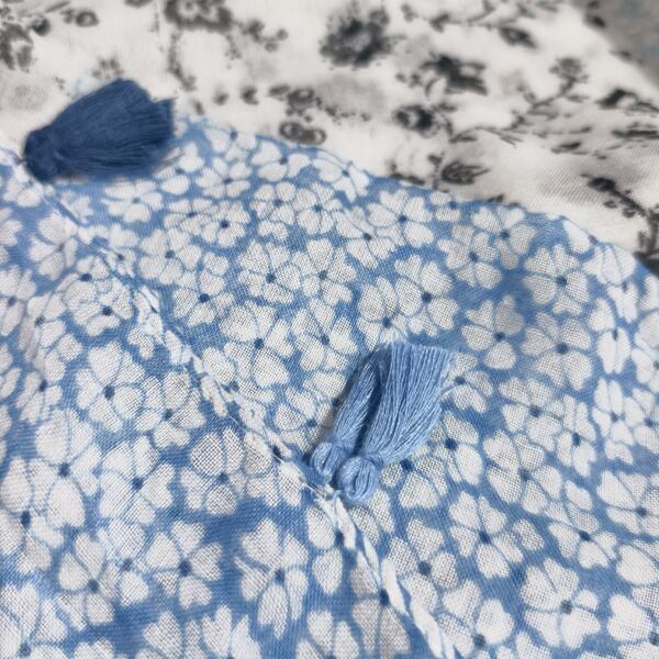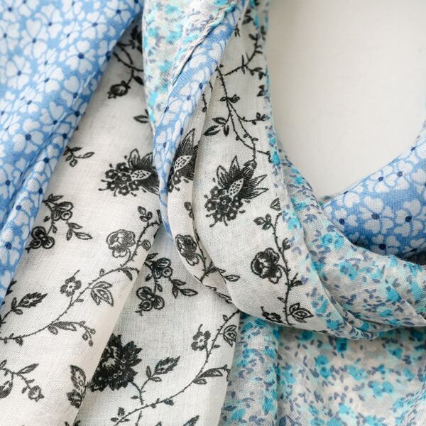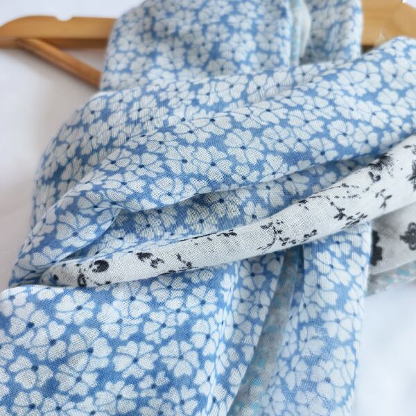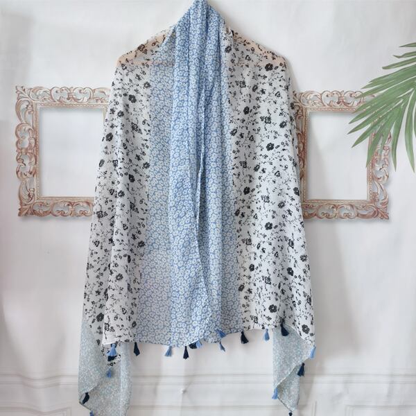 春にぴったりのフラワーテーマを基にしたデザインのスカーフ 三種類の花柄がストライプ状に描かれ、青と白の調和が優雅に配置され フレンチカントリーの雰囲気を演出 裾に施されたタッセルが全体を柔らかく引き締め シーンに応じて異なる表情を楽しめる薄手仕様 ma0414a