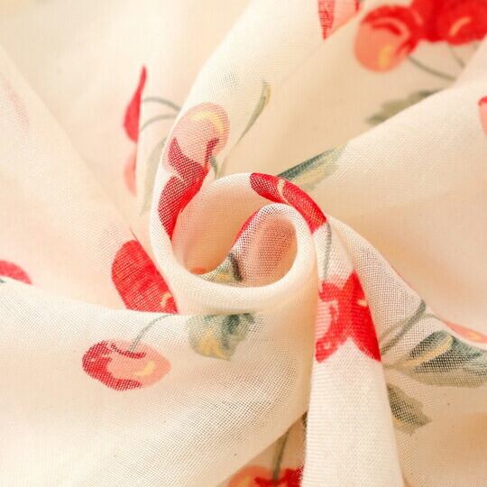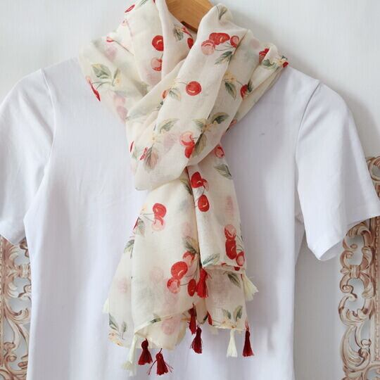 手描きのさくらんぼ柄が魅力的な大判ストール さくらんぼのデザインは「幸運」や「豊穣」「楽園の果実」といった象徴的な意味を持ち 身に着けるだけで特別な気分に 軽やかな素材感が特徴で、春夏のファッションにぴったり 薄手でありながら日焼け止め効果ma0362a