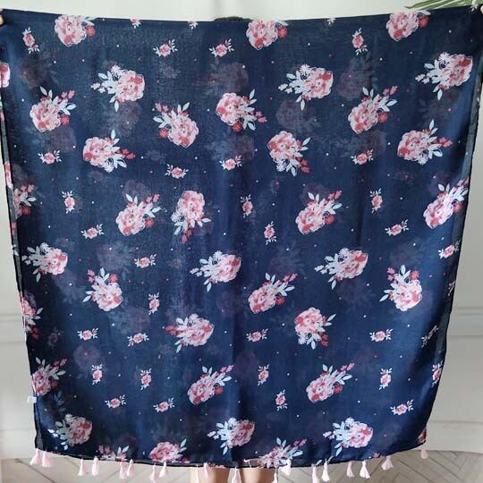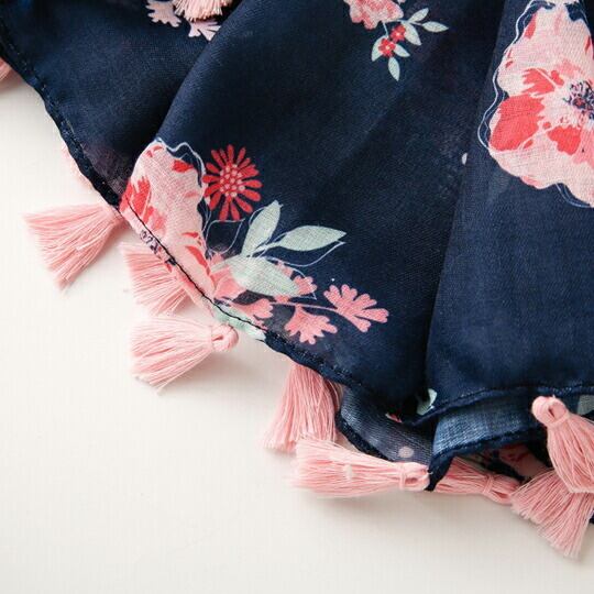 首元に華やかさを添えてくれる花柄プチストール シックな色合いが大人の女性にぴったりなストール なめらかな肌ざわりの素材で 高級感を醸す一品 ネイビーにピンクのフラワープリントをのせた華やかながらも 春 夏 秋 日焼け止め ma0180a 2月誕生花