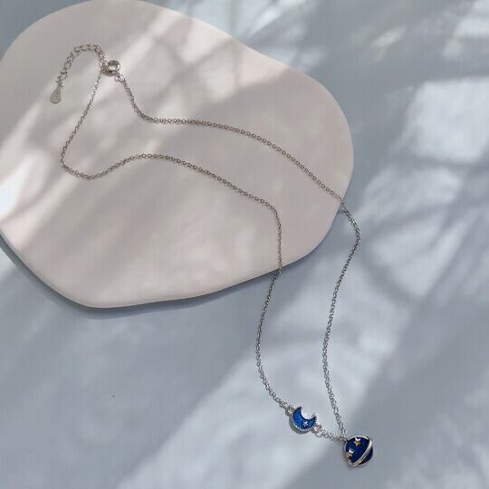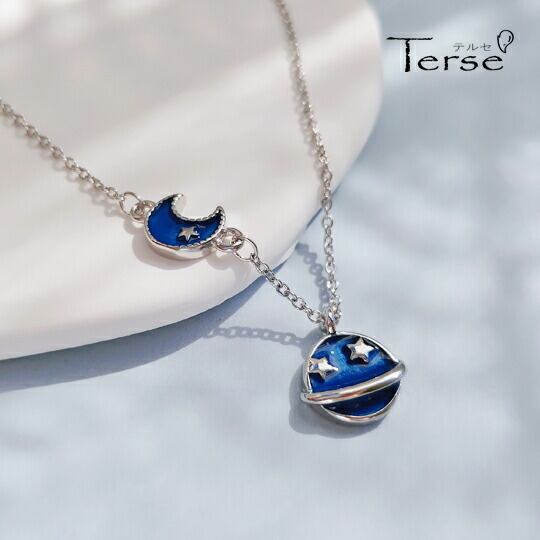 Terse 瑠璃色の惑星と月のアシンメトリーペンダント 可愛らしさの中にも、宇宙の神秘を漂わせるお洒落なデザイン夜空 惑星 宇宙 土星 サターン ムーン 三日月 プレゼント ギフト 普段使い お出かけ ネックレス しるシルバー925 春夏 sn0305a