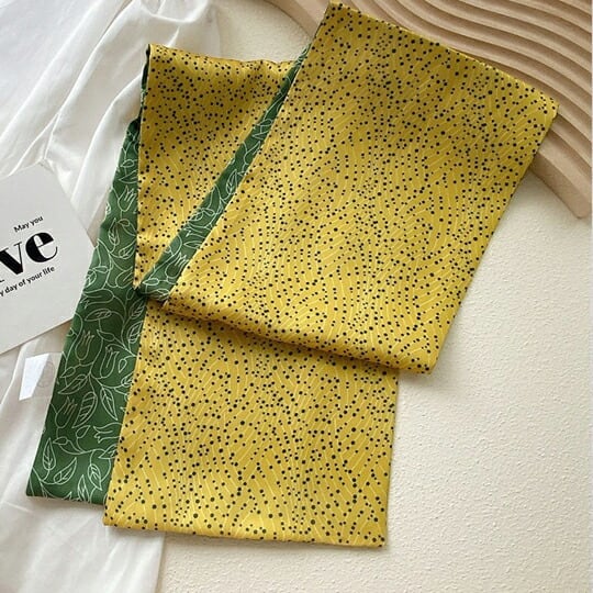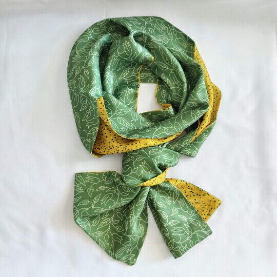 グリーン色のドッド柄とイェロー色のボタニカル柄が特徴のリバーシブルスカーフ 細身のデザインで多様な使い方が可能 クールカラーとウォームカラーのコントラストが魅力 シンプルな装いにアクセントを加え、日常のファッションを一段と引き立てます ma0391agr