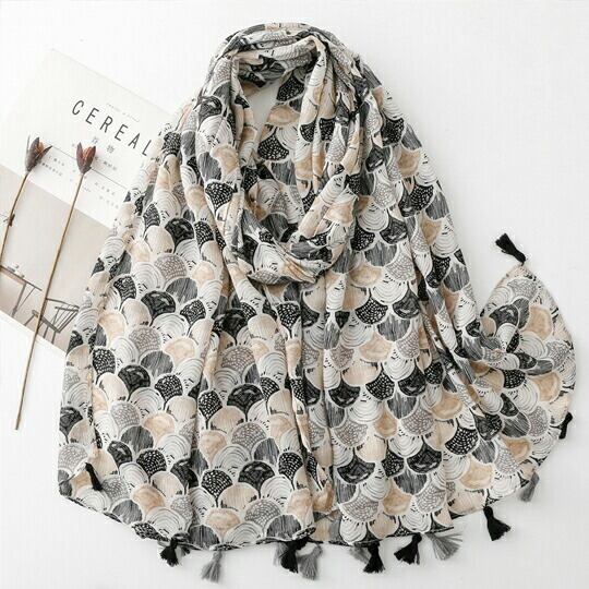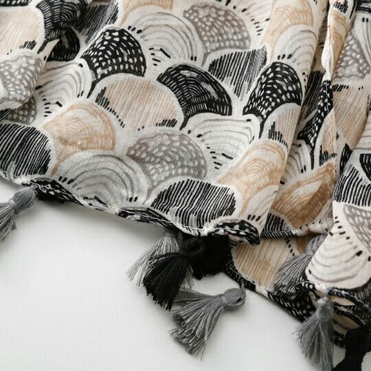 黒、白、ベージュのバランスが絶妙に配された大判ストール モダンながらもクラシカルな雰囲気を演出 洗練された配色と上品なデザインで、どんな装いにも洗練されたアクセントを加え 軽やかな素材感で季節を問わず快適 タッセルがさりげないアクセントとなり ma0346a