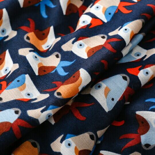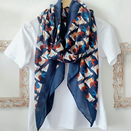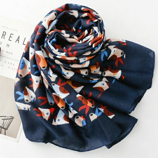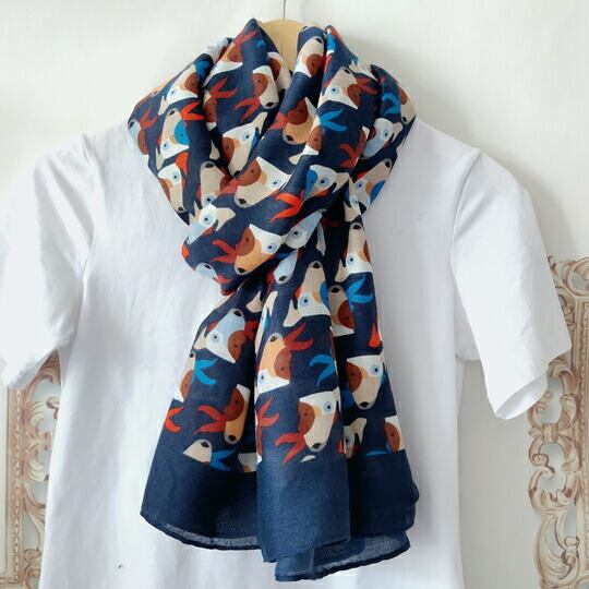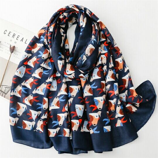 イギリス貴族のスポーツとして愛好されたブルテリア柄の大判ストール 犬好き、愛犬家、ペット愛好家の方へのプレゼント ネイビーの生地に子犬の目と顔にハッピーな表情が映えるブルテリア柄 紫外線対策 UVカット カジュアル 散歩 遊び心 いぬ 小犬 ユニーク ma0342a