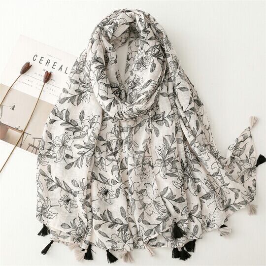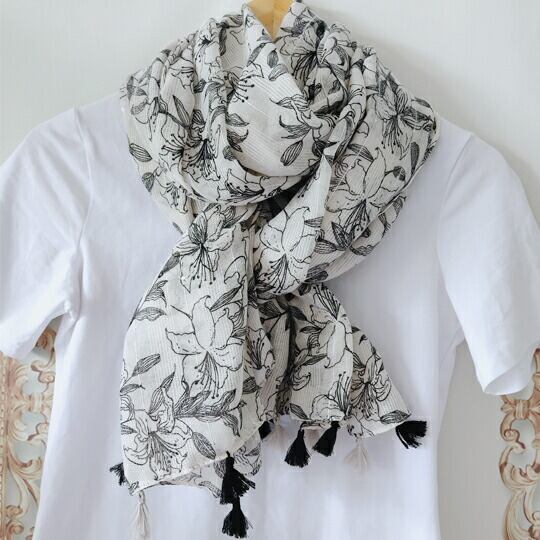 このストールは、単色の花柄でトレンドを一歩先取りした特別なアイテムです。北欧の手描き風の美しい線描きが、さりげない華やかさを演出してくれます。どんなスタイルにもマッチして、日常使いから特別なシーンまで幅広く活躍することでしょう。