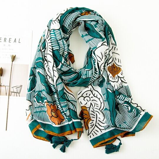 コーデの差し色として使えるグリーンは、可愛らしい印象になりカジュアルな装いにぴったりです シンプルな服装に彩りを添える鮮やかな花柄をあしらったマフラー コートのいらない時期も少し羽織るだけで便利なおしゃれな大判ストール ma0087a