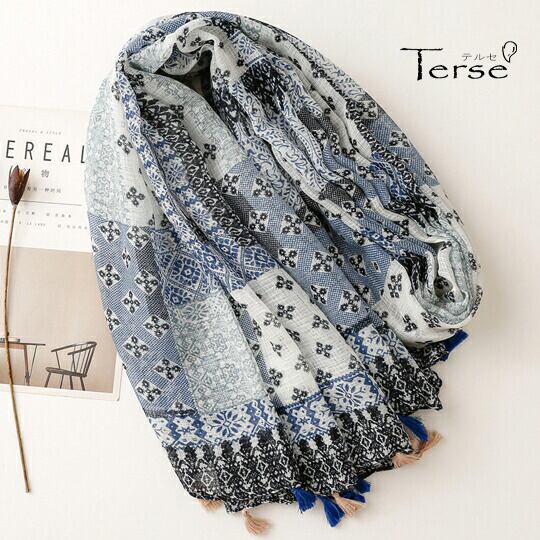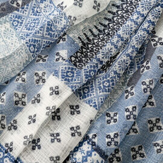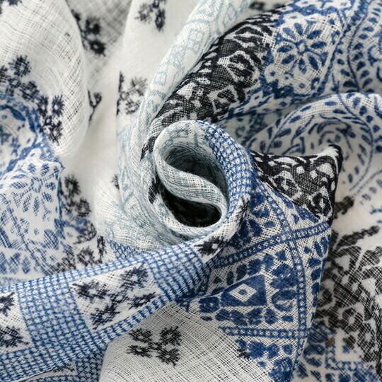 軽量なパッチワークプリントの大判ストール 軽くソフトな肌触りに仕上がっています ボリュームのある生地感が、首元に美しい立体感を演出 柔らかな風合いと使い勝手のよい大判サイズで、一年を通して身に着けていただけます 春夏 タッセル付き ブルー 爽やか ma0206al