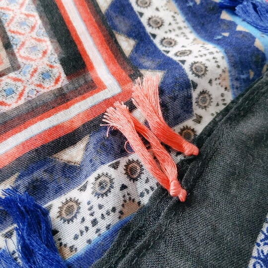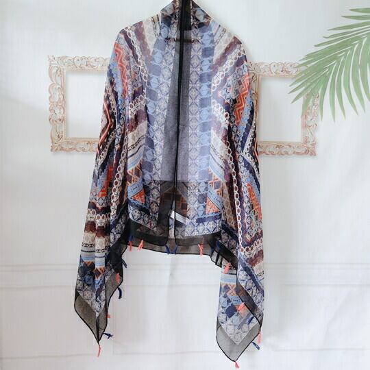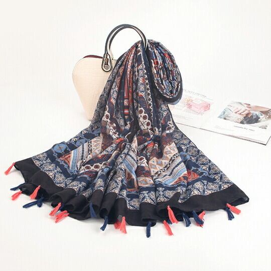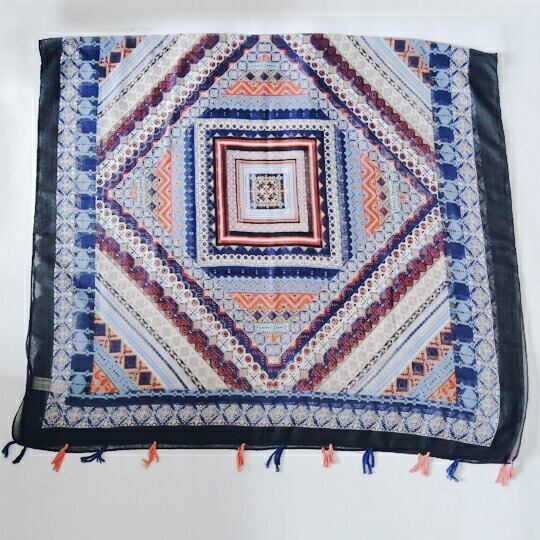 華やかな薄手大判薄手ストール 普段のコーディネートに取り入れやすい、深みのある落ち着いたカラーリング 幾何学模様がアクセントに 巻くだけでスタイリッシュに決まるエスニックな柄 巻き方次第で雰囲気が変わるので飽きのないアイテム 肌ざわりの良い素材 ma0283a