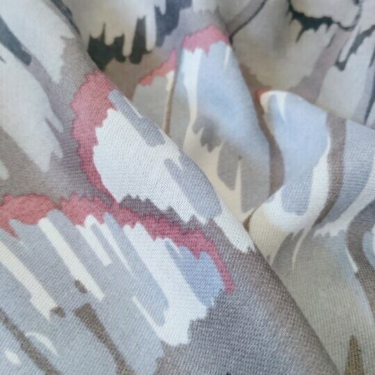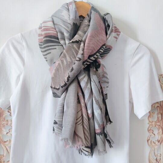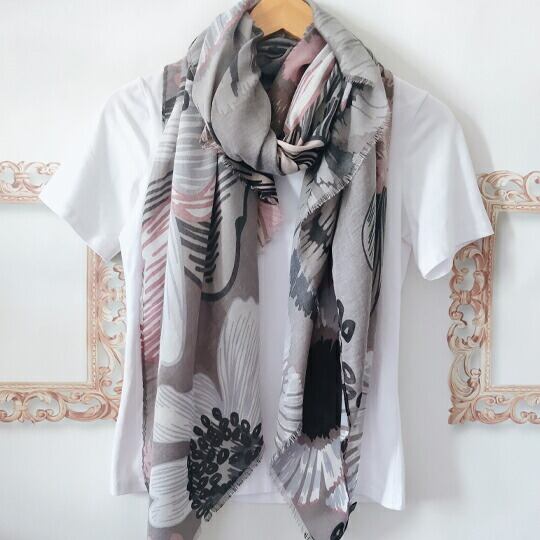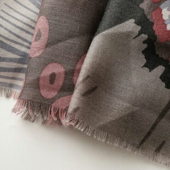 グレーとピンクを基調としたくすみカラーの大きな手描きのフラワーデザイン大判ストール 優しい色合いで、落ち着いた上品な印象を与え 年齢を問わず多くの方に好まれる一品 発色が控えめで、どんな装いにも自然に馴染み、日常のスタイルをさりげなく引き立 ma0360a